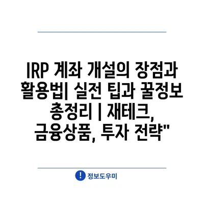 IRP 계좌 개설의 장점과 활용법| 실전 팁과 꿀정보 총정리 | 재테크, 금융상품, 투자 전략”